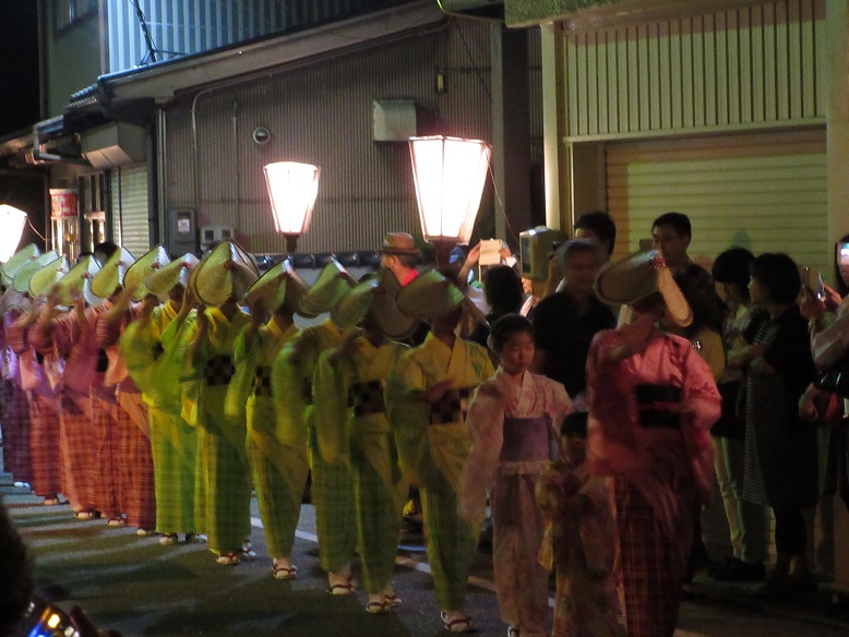 ↑左がぼんぼりの写真右が町流し(天満町)の踊りの様子です町流しは地方(じかた)の演奏とともに踊り手の人たちがおわらを踊りながら町内を練り歩くもので、古来からのおわらの姿を伝えるものとされています。