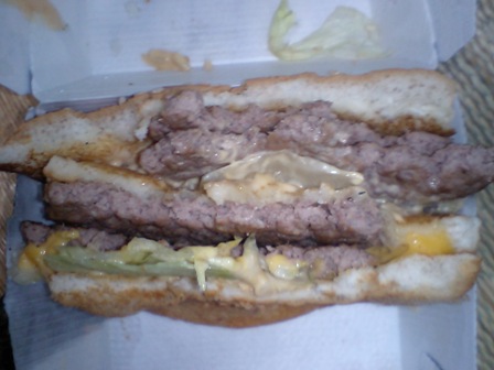 ↑半分にしたメガマック本体ですバンズはビックマック同様3枚ですが、ビーフパティが4枚、ビッグマックプラス2枚です。。。。。