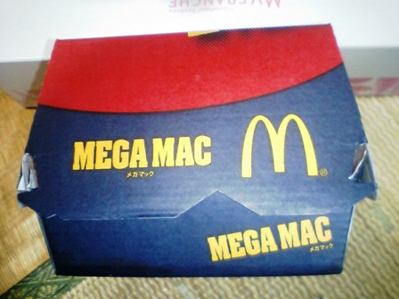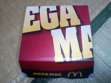 今、一部で話題の、日本マクドナルドから販売中のメガマックを、今日食べました、、、、いやはや、なんちゅうテモ、厚い、ビーフパティ(ハンバーグ部分)が4枚、、、バンズ(パン部分)やその他のソース等は、ビックマックと同じなのですが、肉の量が半端じゃない、、、地元の新聞に入ってきていたクーポンでポテトM・ドリンクMのメガマックセットにナゲットまで頼み家に帰ってきてメガマックを食べ始めたのですが。でかくて、ポテトやナゲットを食べるのは、なかなかつらいものがありました。(苦笑)皆様におかれましてはメガマック注文の際には、ポテトS・ドリンクSのセットをお勧めします。(笑)というわけで画像はメガマック本体(笑)と外装です。
